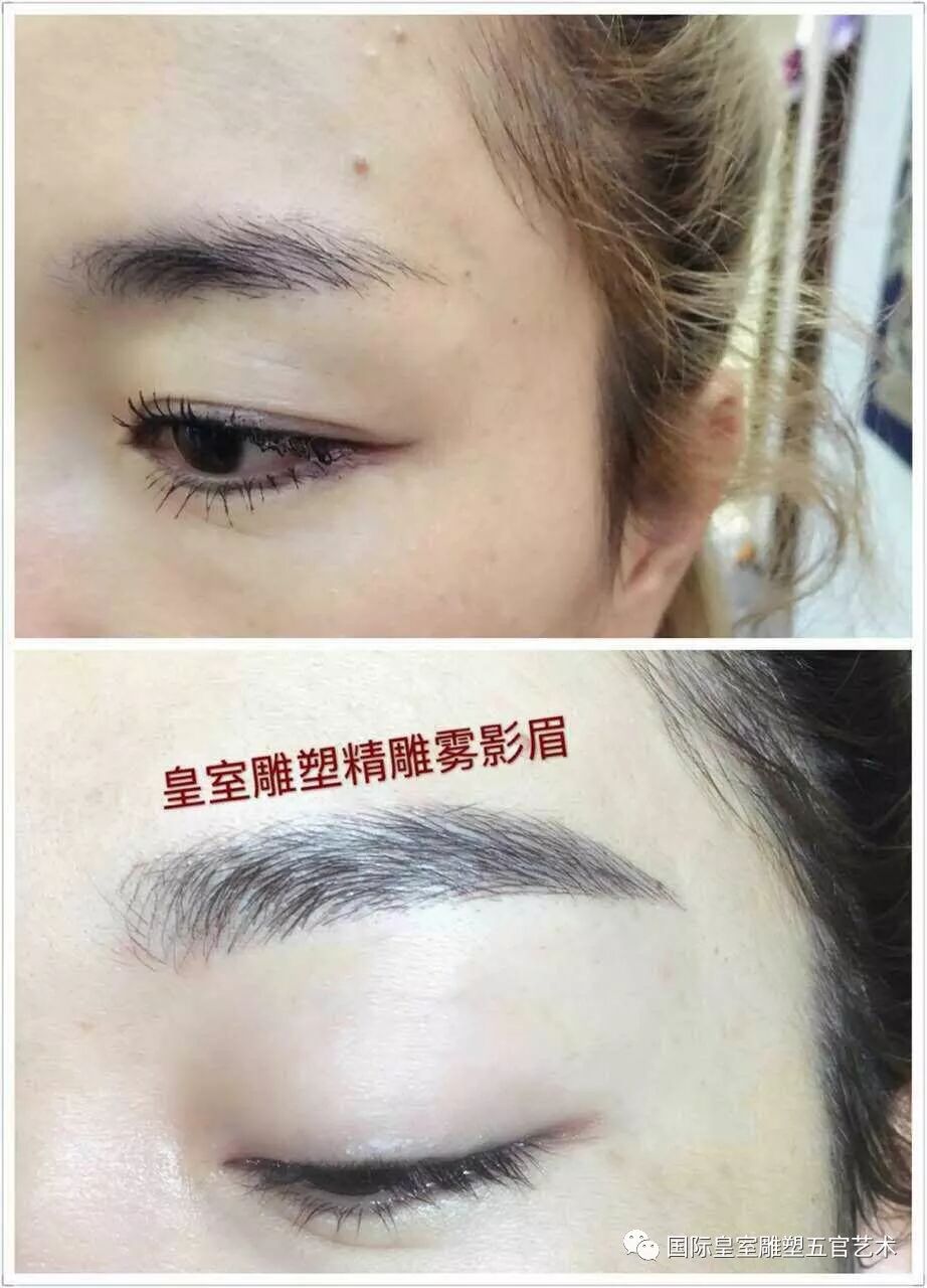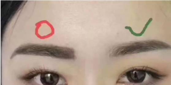 左边是MM自己画的眉毛。眉眼间距很大眉毛弧度大,比较弯同时把眉骨显得非常突兀,右边是纹绣师设计的眉毛。
